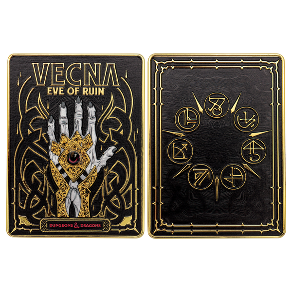 The Eve of Ruin is upon us save the multiverse from total annihilation in the hands of evil lich-God Vecna! Team up across timelines, worlds, and universes to build the Rod of Seven Parts and defeat this deadly being. Featuring Vecna's infamous hand heavily embossed into its face, this collectible metal ingot is finished with detailed antique gold and black enamel touches.